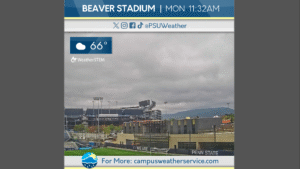 /in Blog/by Eli PosaOn Saturday, we saw light rain south of State College, bringing with it cloudy skies for Saturday night. These clouds cleared out by Sunday, leaving pleasant conditions for the second part of the weekend and on Monday. Mild temperatures expected today with partly sunny conditions, with high temperatures decreasing as we move throughout the work week. Temperatures expected to rebound into next weekend, with little to no precipitation within the next week.